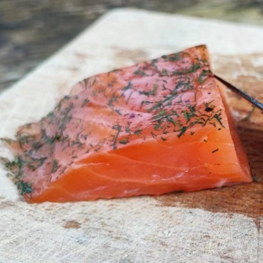 Saumon fumé à la buche de hêtre et salé au sel sec de Guérande. Tranché au couteau.